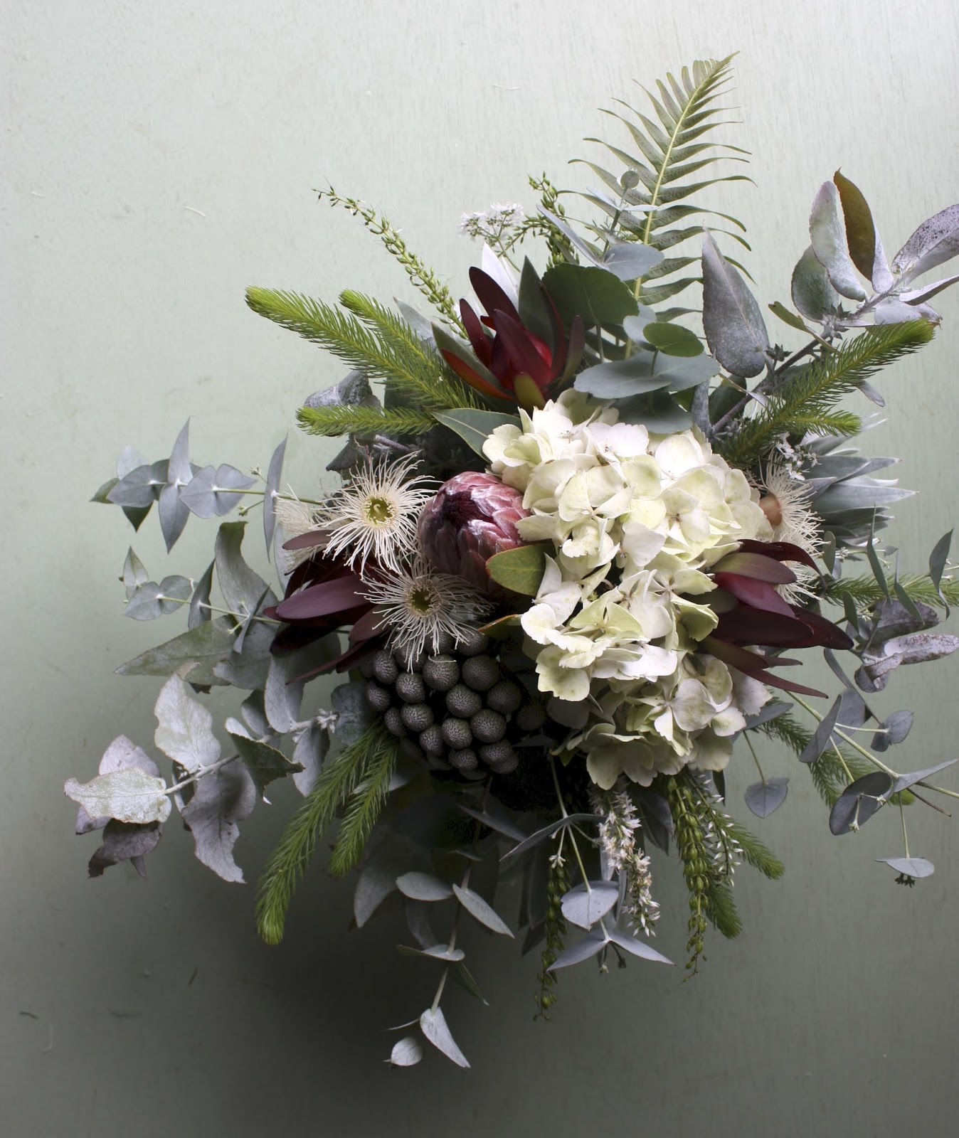 For this November wedding, the colour scheme was silvery foliages and warm whites. I used a cream Protea Repens - late to be flowering in November, Berzelia berries, and creamy white Leucadendron Discolour. For foliage, I used Risdon Peppermint, Agonis Flexuosa, and L. Silver Tree. I also used Dryandra Formosa, Sea Holly, and Pimelea Nivea or Bushman's Bootlace. Some green leucadendrons were also used, with the result a leafy textured bouquet with a pared back palette.