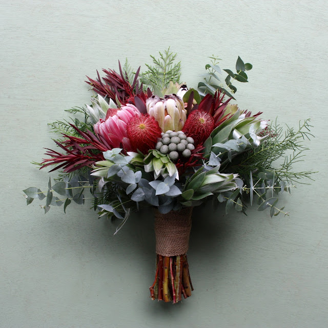 I used some silvery Brunia Albiflora which is always looking fabulous in February. You can just see, peeping through on the left, a rusty brown leucadendron cone which I love to use to add warmth and texture.